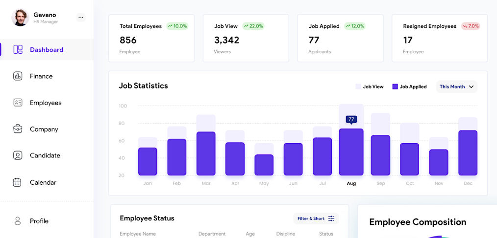This time it’s a free Figma Human Resources dashboard template designed in Figma. This is a well thought-out dashboard design. It gives all the information that an HR Manager would require in one screen. It’s got summaries for number of employees, visitors, and applicants. It also shows the trend compared to the previous period. Everything that an HR manager would require is at his/her fingertips with this design.
